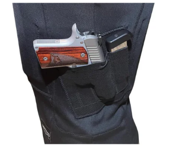 - Optional integrated concealed carry elastic holster for compact handguns (e.g., Glock 43, Sig P365 XL).