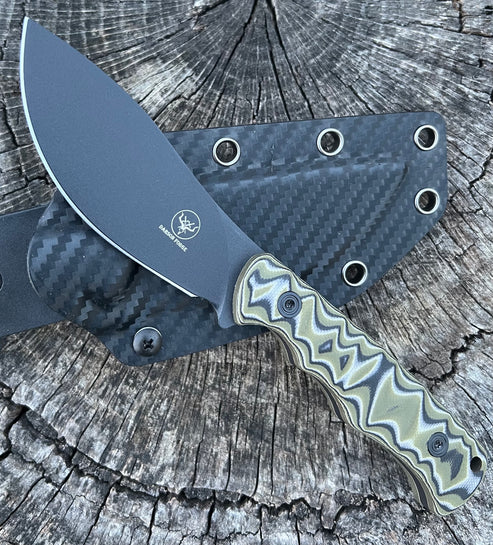 This knife is a DARSON FORGE CARBON-SERIES 005. It is made of the best raw materials available in the market. The 1095 high carbon steel is developed with the appropriate hardness to maintain the knife's edge for a lengthy period, and all our blades are tested to ensure they are razor sharp. The blade thickness of 5mm and titanium coated paint on the blade ensure its use as a hunting, skinning, tactical, defensive, everyday carry, survival, tough, and outdoor use knife. The handle of this knife is made of 3D CNC Processed G10 which gives it more durability and allure. 2mm thick CARBON FIBER KYDEX sheath allows us to safely lock the knife after every use. The belt clip is adjustable and can be used vertically/horizontally. Lastly, each knife is packed in a foam-padded hard paper box.
