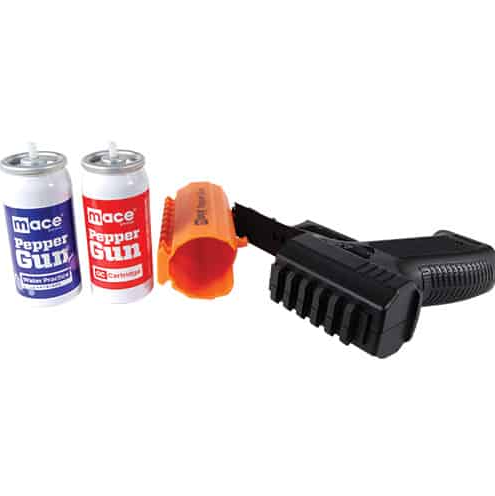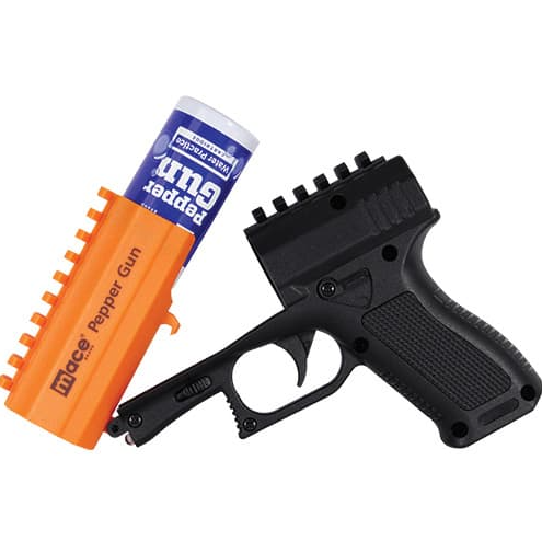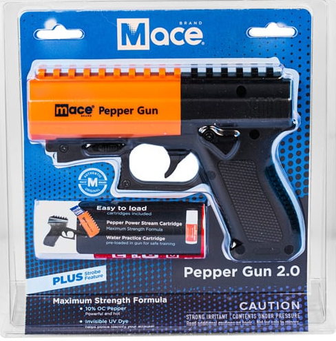 The Mace® Brand Pepper Gun 2.0 provides distance defense with convenient point-and-shoot accuracy. The advanced delivery system sprays a power stream of OC pepper up to 20 feet away and from any angle. Refill the Pepper Gun with easy-to-load cartridges. DUAL MODE LED light distracts your attacker and helps aim at your target in the dark. Engage the trigger once to activate the steady LED flashlight feature. Engage the trigger a second time for the pulsating LED strobe. Comes with a OC Pepper Cartridge and a Water Practice Cartridge. Integrated Picatinny rail allows you to attach accessories to your Pepper Gun.