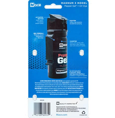 MACE PEPPER GEL is a Patented formulation of pepper spray which is suspended in Gel instead of a liquid stream. This Pepper Gel formulation results in several advantages: