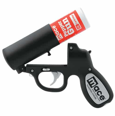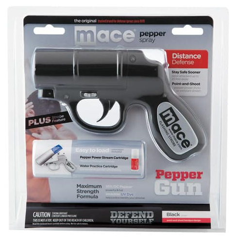 The Mace® Pepper Gun is the most accurate non-lethal self defense Pepper Spray available. Ideal for distance defense with the convenience and accuracy of a point-and-shoot handgun design, its advanced delivery system allows you to spray attackers with a power stream of OC pepper from up to 20 feet away and from any angle. This Mace Pepper Gun with STROBE LED features a trigger activated DUAL MODE LED light that distracts your attacker and helps aim at your target in the dark. Pull the trigger once to activate the steady LED flashlight feature. Pull the trigger a second time and the pulsating LED strobe light is engaged. Pepper Guns are easy to reload with pre-filled replacement cartridges and each gun includes (1) Water Practice cartridge (1) OC Pepper Spray cartridge and battery for LED light models. You can safely DEFEND YOURSELF in a threatening situation with the effective power of Mace Maximum Strength Formula 10% OC Pepper with invisible UV marking dye that can help police identify your attacker. Just spray and get away!